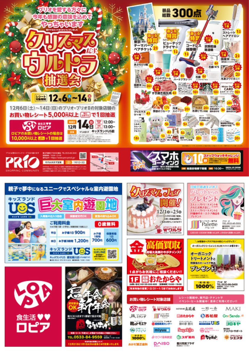 12/6~14のプリオ・プリオⅡの対象店舗でのお買い上げ金額が5,000円(税込)以上のレシート1枚で1回抽選に参加可能です。(※複数枚での合算は不可・ロピアのレシートは10,000円以上となっております)